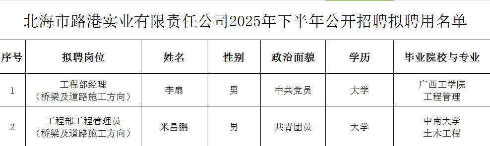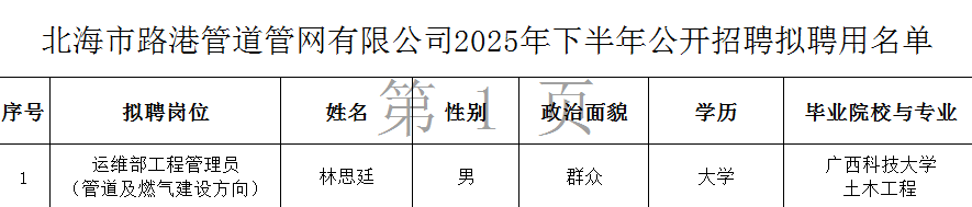 2.北海市路港管道管網(wǎng)有限公司2025年下半年公開招聘擬聘用名單