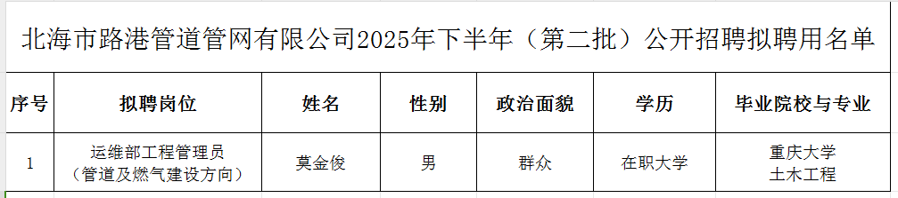 根據(jù)《北海市路港建設(shè)投資開發(fā)有限公司2025年下半年(第二批)公開招聘工作方案》相關(guān)要求,經(jīng)過報(bào)名、資格審核、面試、體檢及考察等程序,確定莫金俊為擬聘用人員(詳見附件),現(xiàn)予以公示。